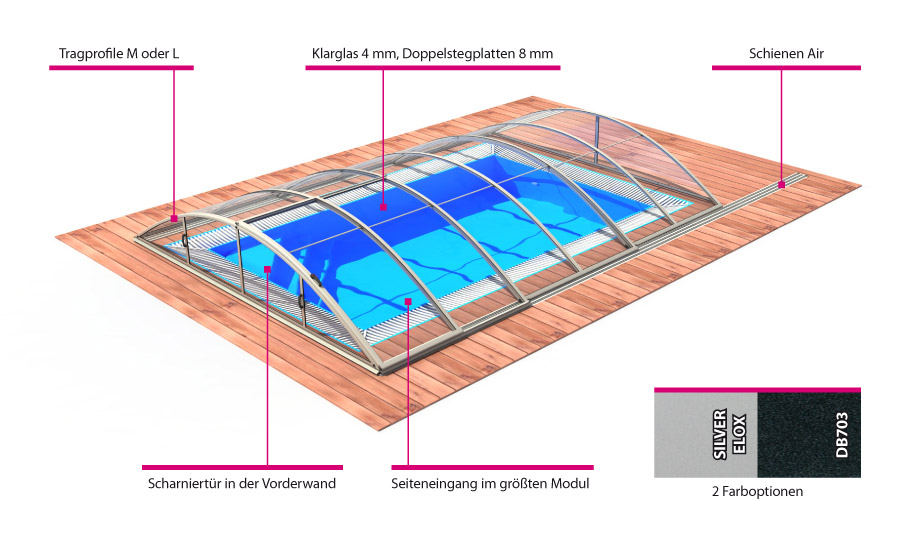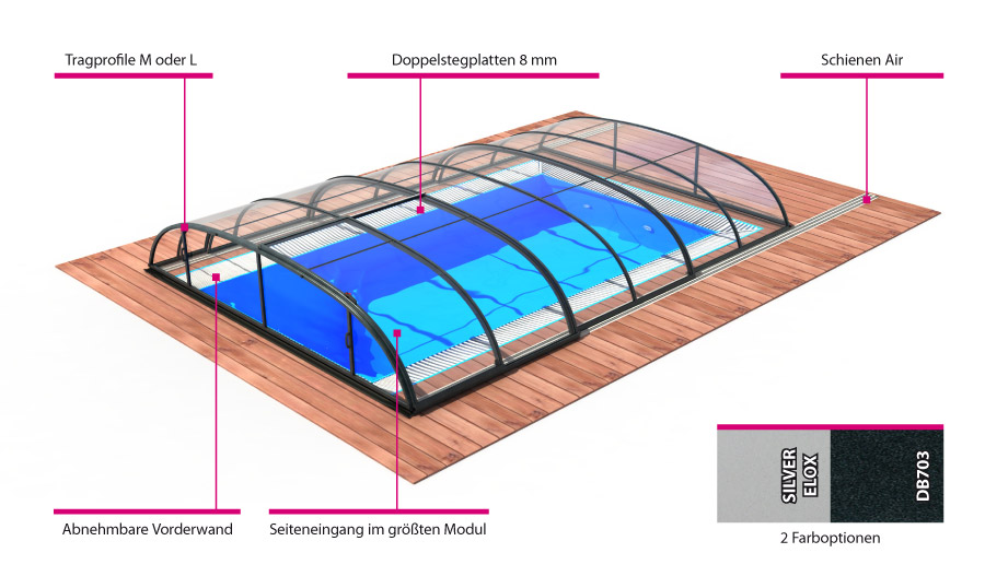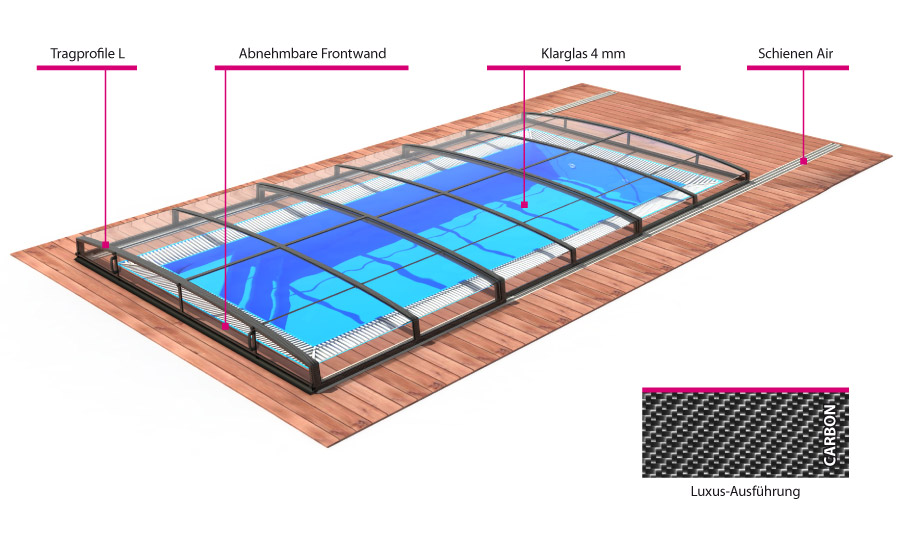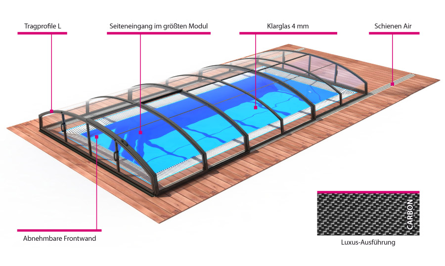 Eine Schwimmbecken-Überdachung, die Ihren Garten nicht verändert. Casablanca Infinity Evo ist die niedrigste Überdachung in unserem Angebot. Diese schicke Design-Losung gewinnt jeder lieb.