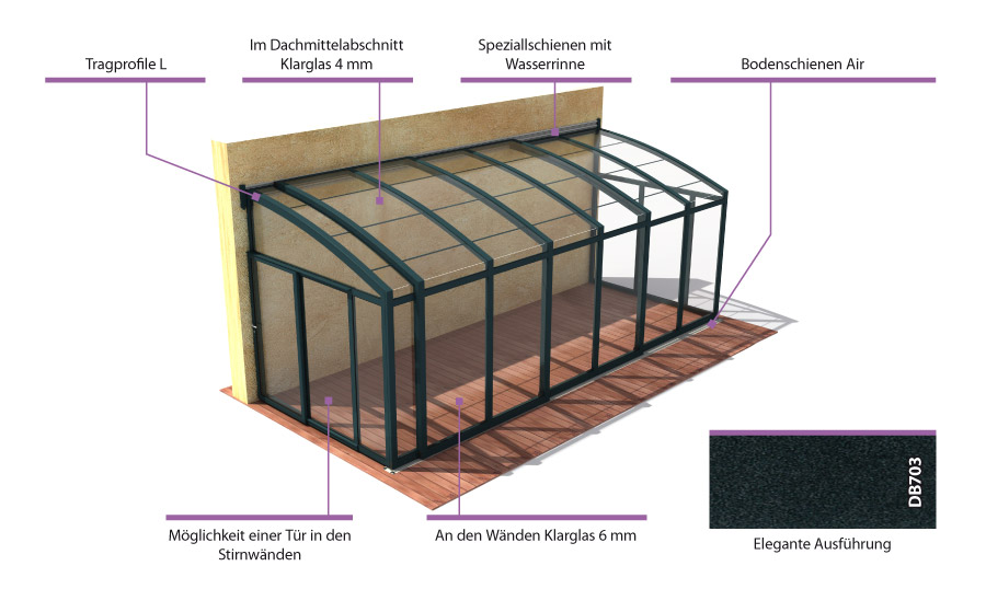 Wenn Sie sich für dezente und gleichzeitig raffinierte Formen interessieren, ist die CASABLANCA INFINITY gerade das Richtige für Sie! Eine niedrige Überdachung, die im Garten auf den ersten Blick sehr unauffällig wirkt, bietet aber einige Überraschungen, durch die sie jedermann fesselt. Zackige klare Dachplatten, eine futuristische Karbon-Form oder niedrige Air-Schienen sind ein Beweis dafür.