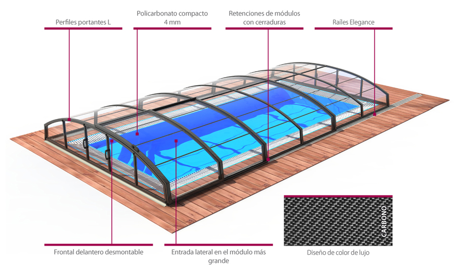 ¡Si le atraen las formas discretas y útiles a la vez, el modelo Casablanca Infi nity está hecho para usted! Su cubierta baja es discreta para el jardín a primera vista y le ofrece muchas sorpresas, gracias a las cuales llamará la atención de todos. Una cubierta seccionada transparente, un aspecto futurista de carbono o los raíles bajos Elegance son la prueba. Esta pieza exclusiva puede cubrir su piscina en tan sólo 7 días.