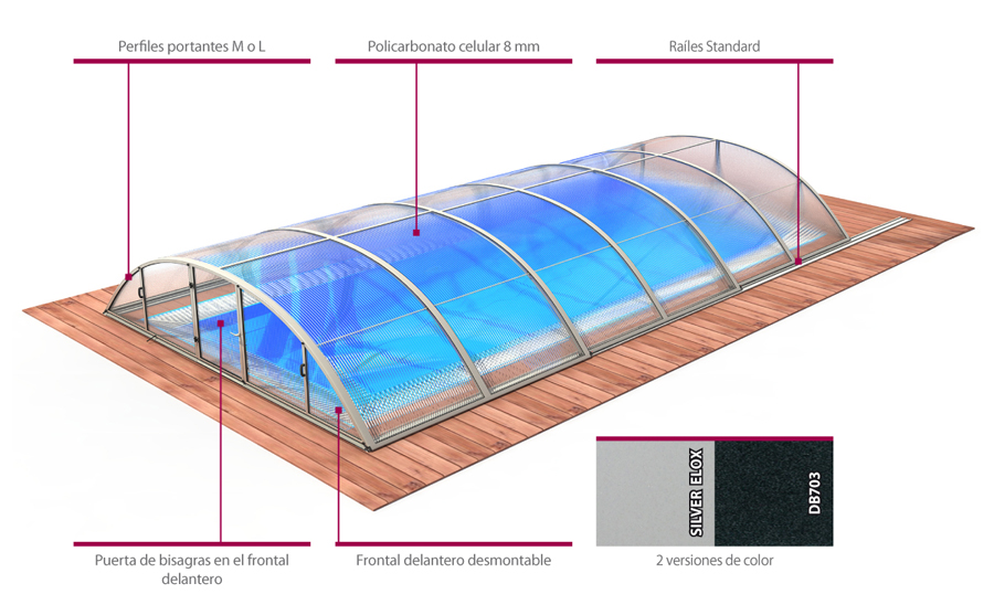 Si está pensando en una cubierta baja y le gustan las formas curvas y elegantes, la mejor opción para usted es la cubierta Dallas. Gracias a sus raíles estándar, entrada lateral, material de la cubierta de calidad aislante y frontal amovible, está asegurado su funcionamiento sencillo en cada situación. ¡Elija una de las dos medidas y colores y podrá tener esta cubierta dentro de 7 días en su jardín!